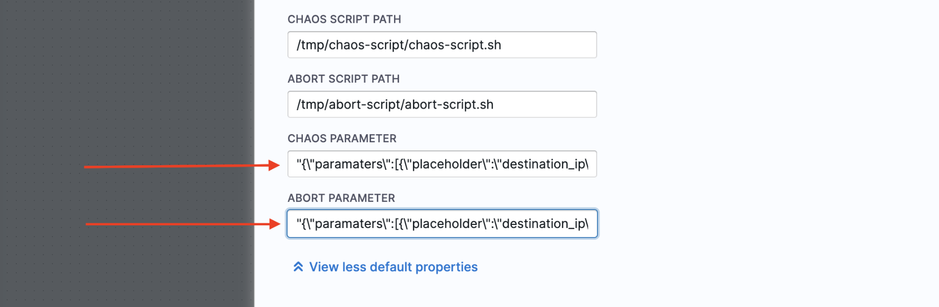 Consider the following example, that passes two parameters, an IP address and a port number to the chaos experiment.