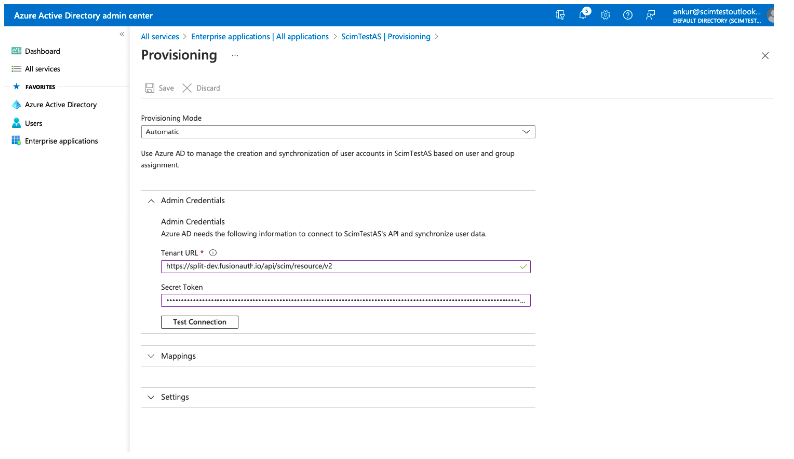 Click the Test Connection button and then Save. You will receive a message indicating that the supplied credentials are authorized to enable provisioning. The mappings and settings sections are now available.