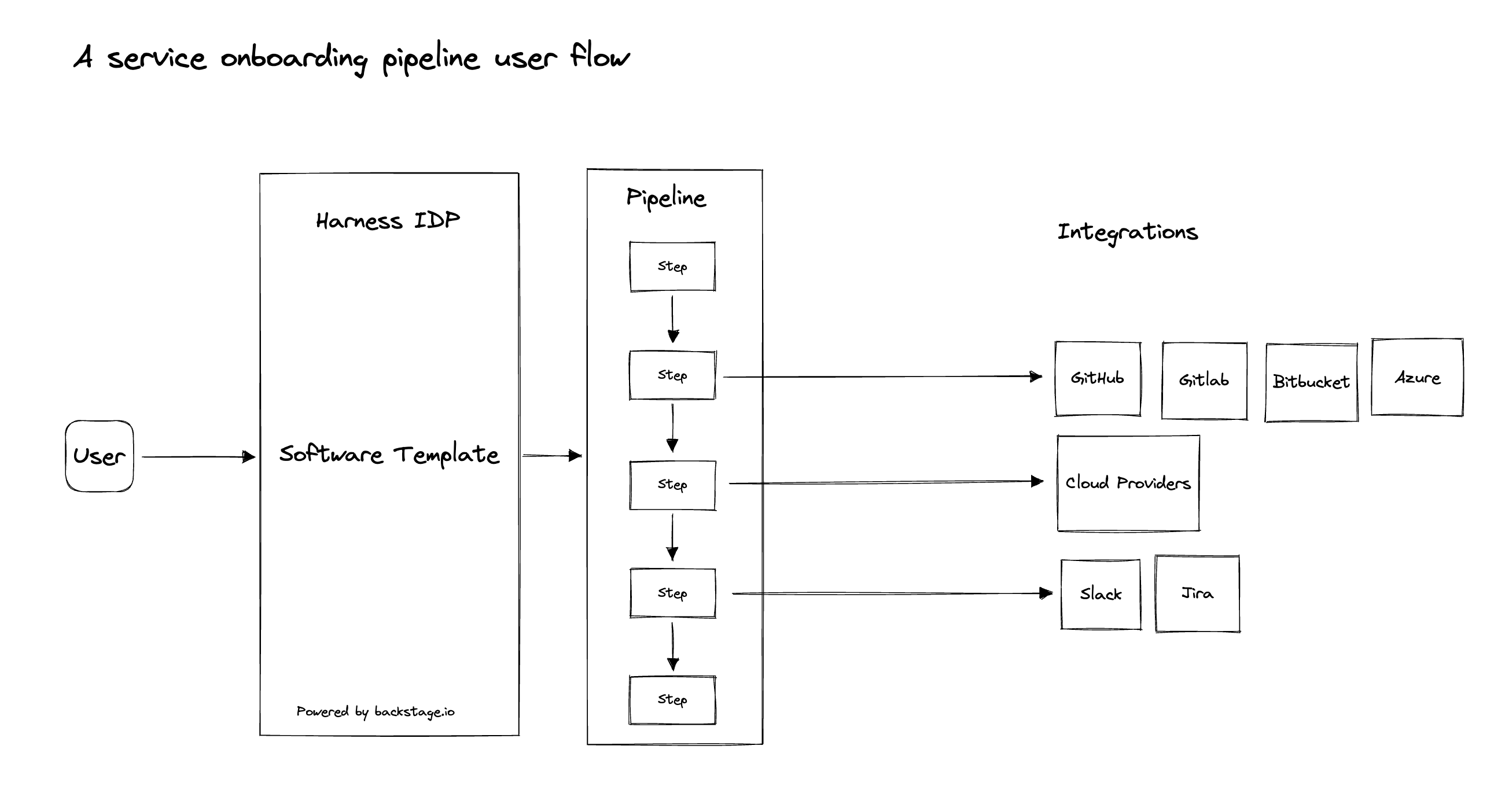 Your users (developers) must perform a sequence of tasks to create the application. First, they interact with a software Workflow. A software Workflow is a form that collects a user's requirements. After a user submits the form, IDP executes a Harness pipeline that onboard the new service. Usually the pipeline fetches a hello-world skeleton code, creates a new repository, and interacts with third-party providers such as cloud providers, Jira, and Slack.