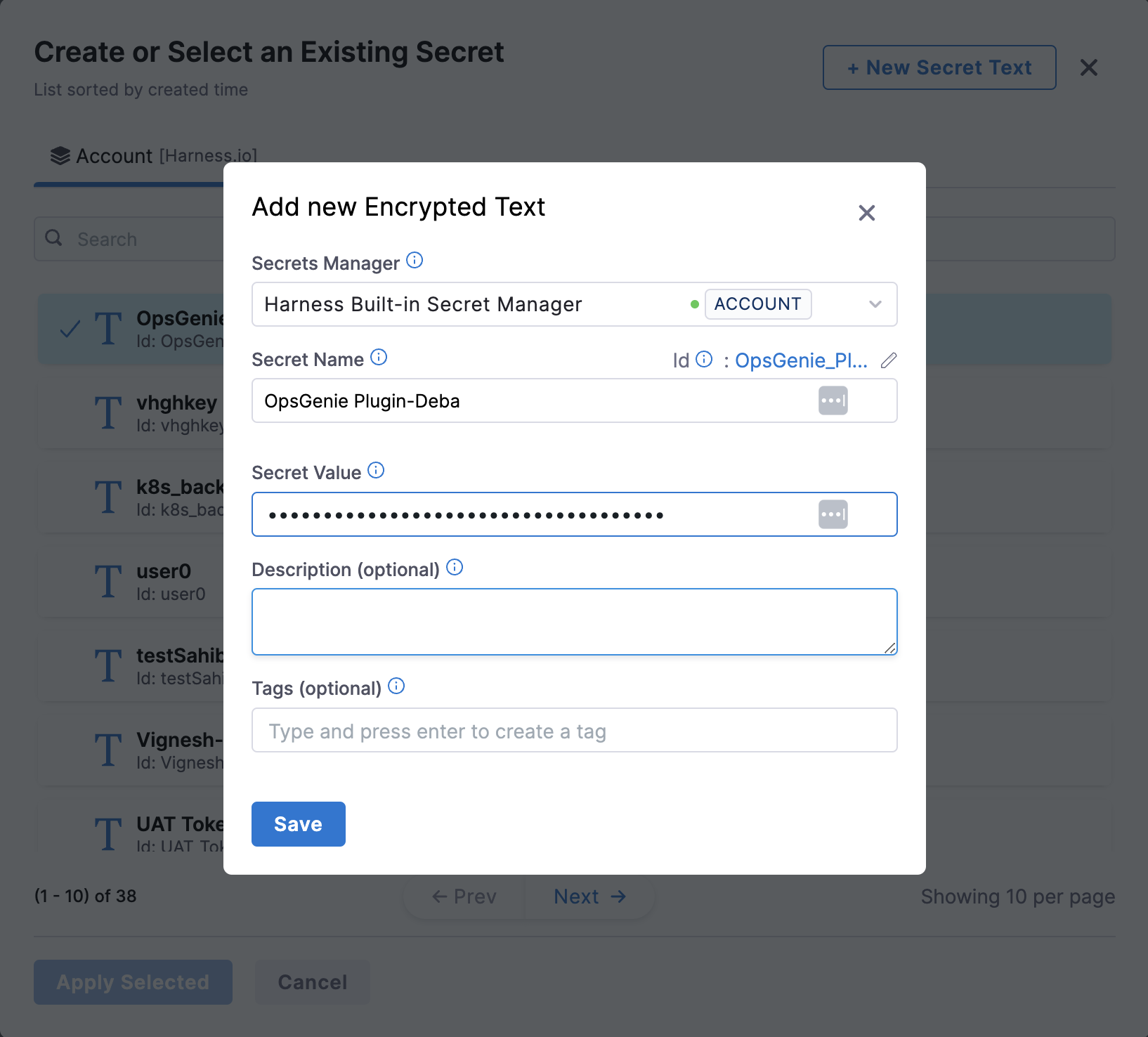 - Create secret in Harness to store API token, click on “New Secret Text” and enter values as shown below.