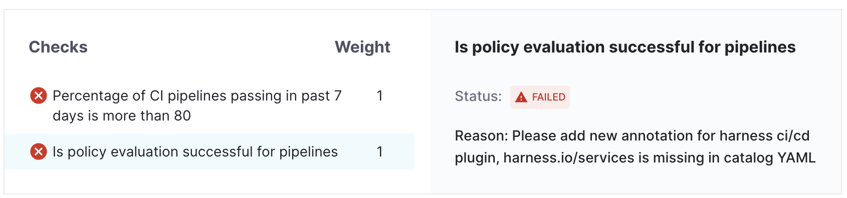 - In case of checks fail because of PagerDuty annotation is missing in catalog info YAML we will get the corresponding error message.
