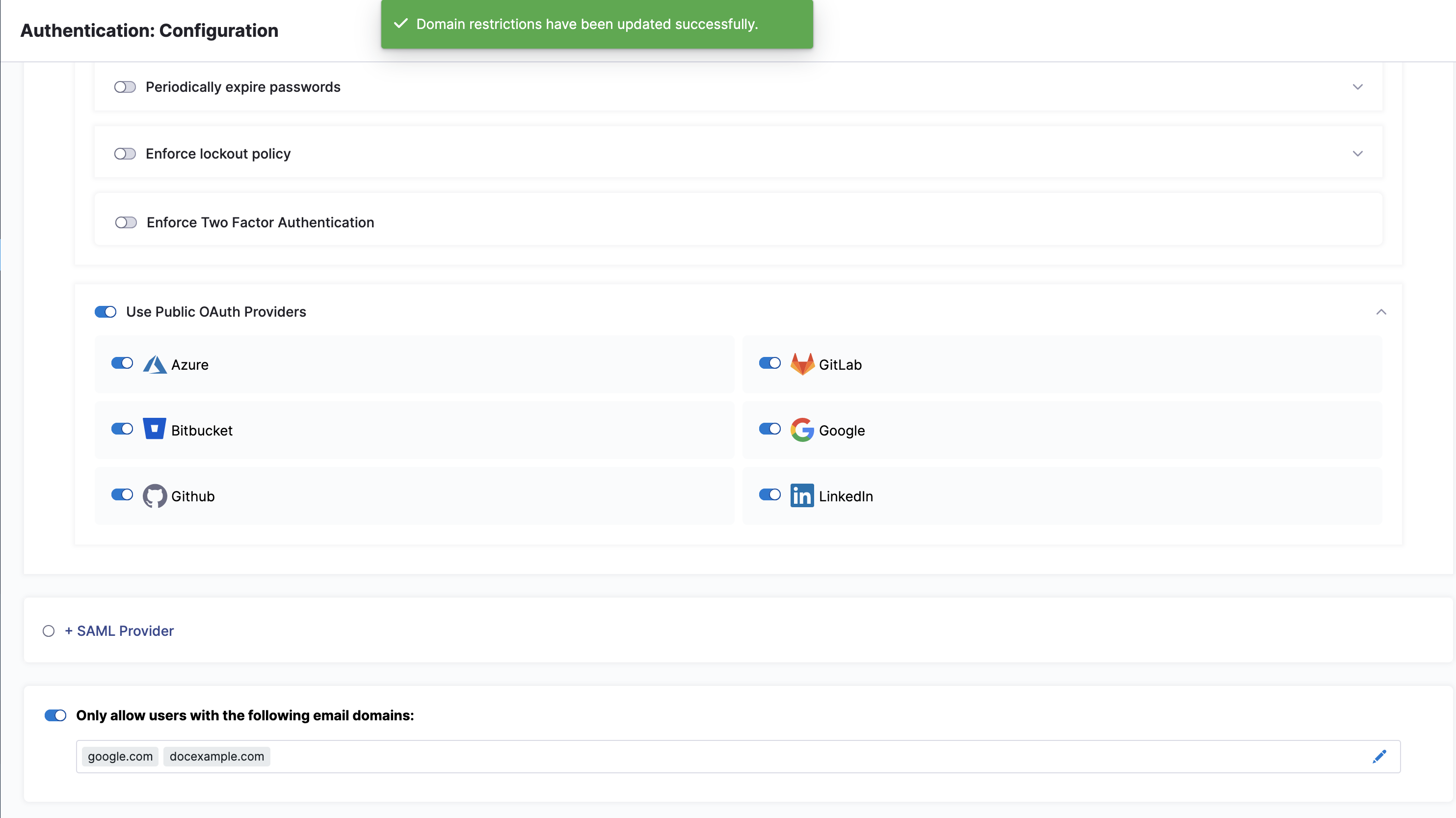 Select SAML Provider to enable a SAML Provider. To do this, you should first disable any configured public OAuth providers. For more on adding a SAML Provider, go to Single Sign-On with SAML.