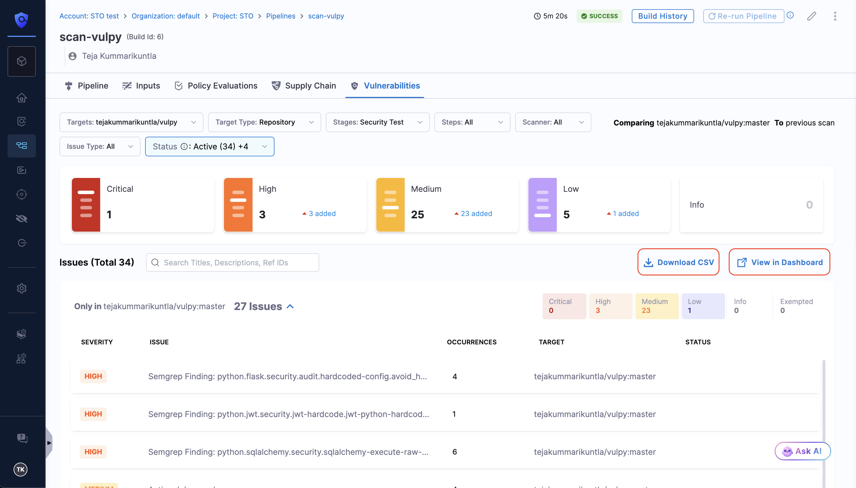 - Navigate to the Pipeline Execution Summary Dashboard from the same tab to export results in CSV or PDF. Refer to Export Scan Results Documentation for more details.