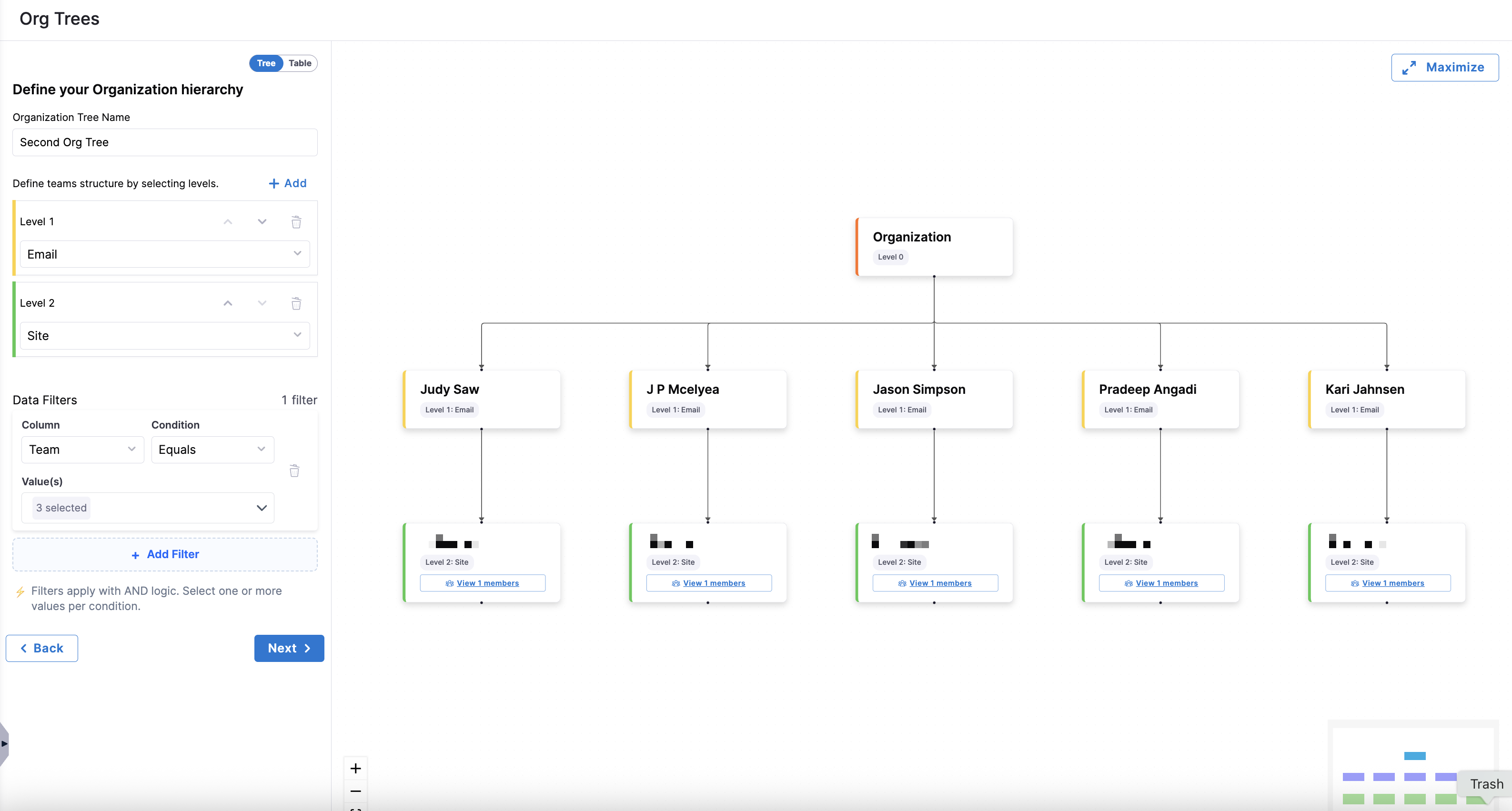 • Data Filters: Apply filters with AND logic to include or exclude specific roles, teams, or locations within your Org Tree.